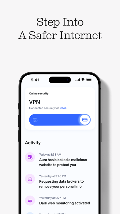 Aura offers an all-in-one solution for protecting your identity, finances, and online activities. With fast alerts, comprehensive security tools, and easy-to-use features, Aura helps you stay one step ahead of threats and maintain your digital safety.