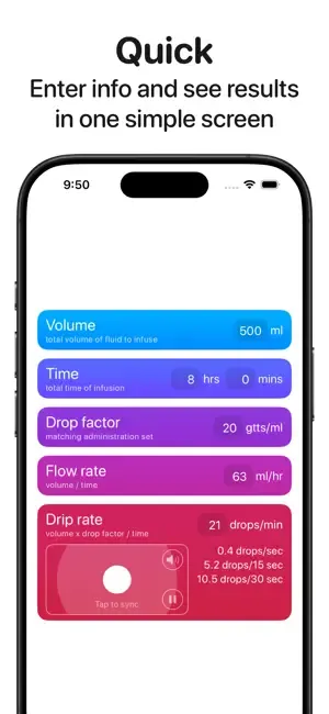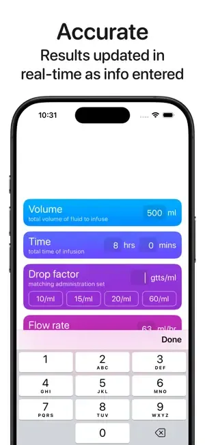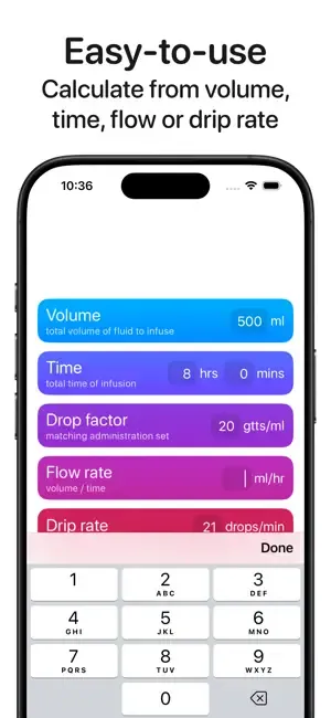 Download the app from the app store and open it on your device. Register with your professional details to customize the app for your needs. Input the required volume and time to get instant drip rate calculations. Adjust settings based on specific medical requirements for different treatments. Explore additional features such as saving and retrieving past calculations for future reference.