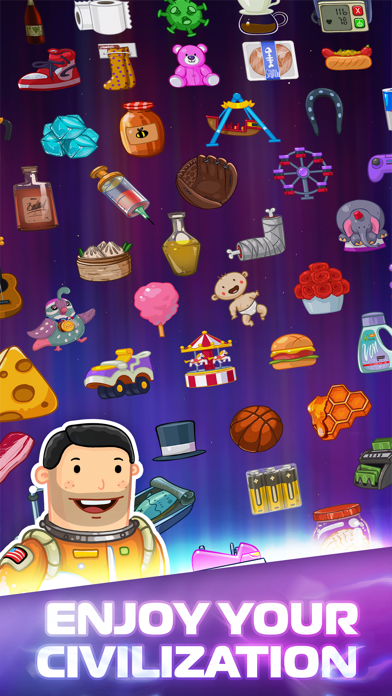 Increase your civilization level through production and research. Use the gems you earn to unlock more technologies and reach the peak of the universe!