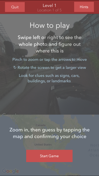1. Start a new game and view the randomly generated image of a real-world location. 2. Analyze the visual clues and details like landscape, architecture, and signage to identify the location. 3. Select your guess on the in-game map by pinpointing the exact or nearby location. 4. Earn points based on how accurately you identify the location compared to the correct spots. 5. Advance through levels, each increasing in difficulty and featuring more diverse and complex locations.