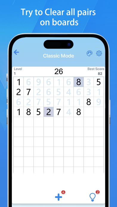 Start by scanning the board to find pairs of numbers that sum to ten. Tap on the pairs to remove them from the board. As you progress, the game becomes more challenging with fewer obvious pairs. Use power-ups wisely to help clear difficult stages. Achieve higher scores by completing levels quickly and efficiently. Challenge yourself to complete as many levels as possible and improve your matching skills.