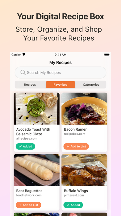 1. Download the RecipeBox app from the store. 2. Register and create an account to start saving recipes. 3. Use the search function to find and add recipes to your collection. 4. Categorize recipes for easy access based on meal type or ingredients. 5. Plan your meals using the built-in meal planner for a streamlined cooking experience.