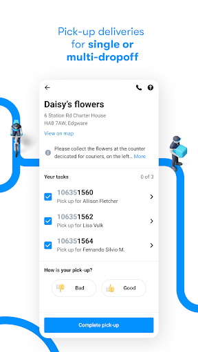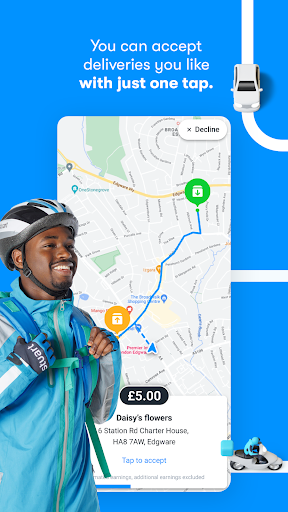 Stuart is an app that connects independent couriers with customers needing delivery services. It offers flexible working hours, allowing couriers to choose when and where they work, and provides competitive earnings. Couriers can accept deliveries, navigate to destinations, and track multiplier rewards for completing tasks.