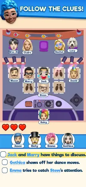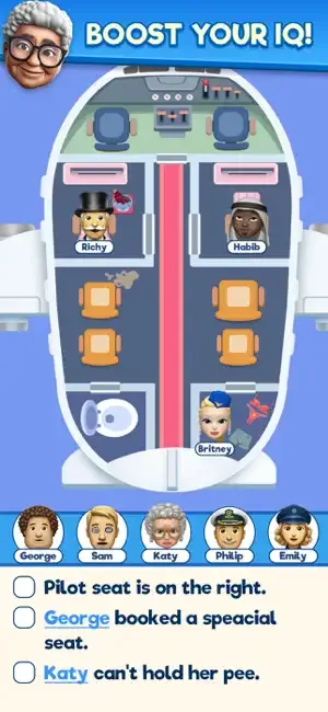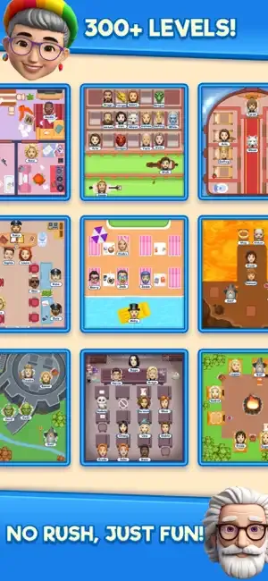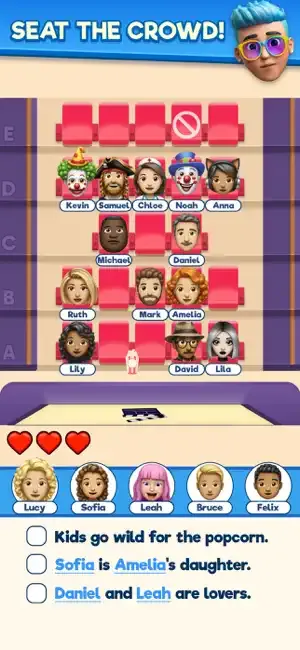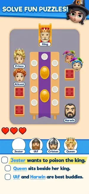 Solve puzzles by arranging characters according to the given logic. Use strategic thinking to determine the correct seating arrangement. Advance through levels by successfully seating all characters as required. Utilize hints if you get stuck, enhancing your problem-solving skills. Enjoy the game offline, making it perfect for on-the-go entertainment without an internet connection.