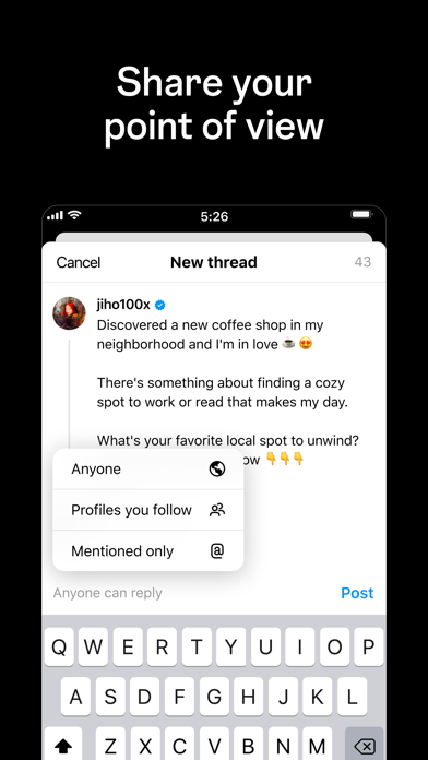 Express yourself freely on Threads by starting new threads to share what's on your mind. This is your personal space where you have full control over who can reply.
